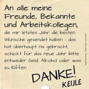 Lieber Keule, herzlichen Glückwunsch zu einem halben Jahrhundert Meisterschaft im Faulenzen, Essen und Biertrinken! Möge deine Couch immer bequem und deine Biervorräte niemals erschöpft sein.“